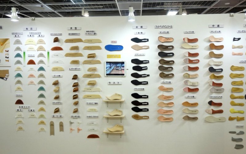 村井のブースでは、シューパーツ製品、フットケア製品を壁一面に展示し、海外資材、新製品を正面のテーブルに展示しました。