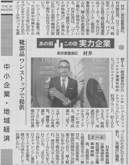 紙面では、当社のシューパーツ事業とフットケア事業の特徴が取り上げられています。