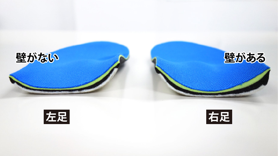 本製品では、右足かかと外側に厚みと傾斜を持たせた“壁”構造を採用。