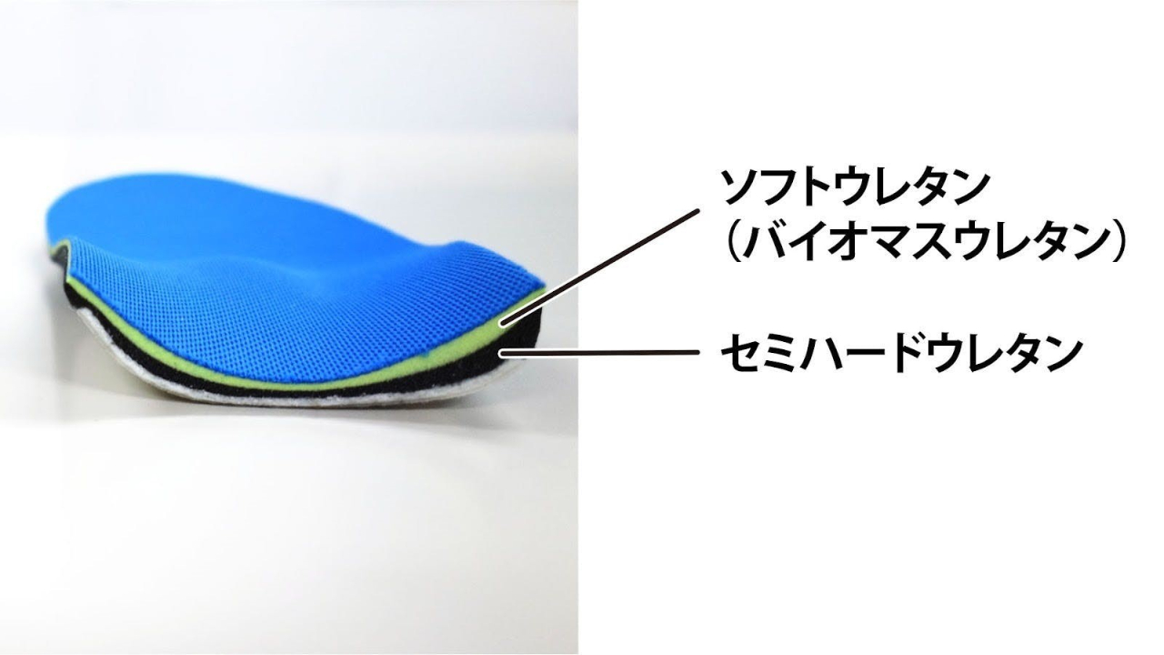 本製品は、足裏にある3つのアーチを支えるクッション構造に加え、トップ層にソフトなバイオマスウレタン、第2層にセミハードなウレタンを使用した2層構造を採用。