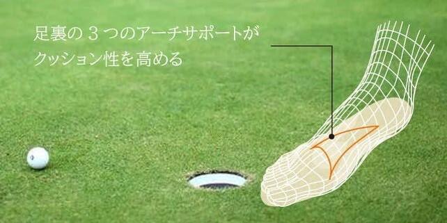 へたりにくい2層構造で、後半まで快適なスイングをサポートラウンド後半になると、疲労によって足のアーチが低下し、膝や腰への負担が増加します。